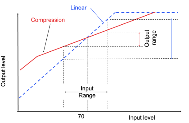 La compresión busca reducir el rango dinámico del entorno para que pueda entrar dentro del rango útil de un oído con pérdida auditiva.