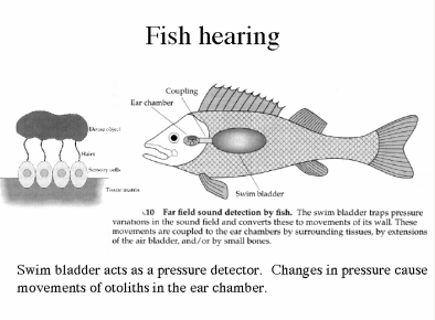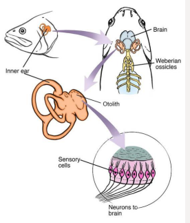 La imagen de arriba muestra cómo la vejiga natatoria convierte cambios de presión en movimiento de los otolitos, permitiendo al pez “escuchar” vibraciones en el agua.
